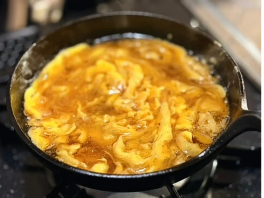溶き卵を、静かに回し入れます。